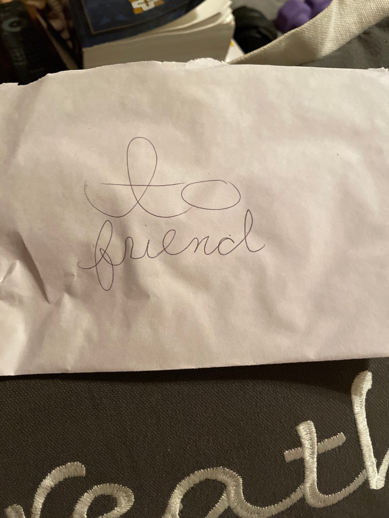 “To friend” – I found this under my cars windshield wiper today! It made my whole day !