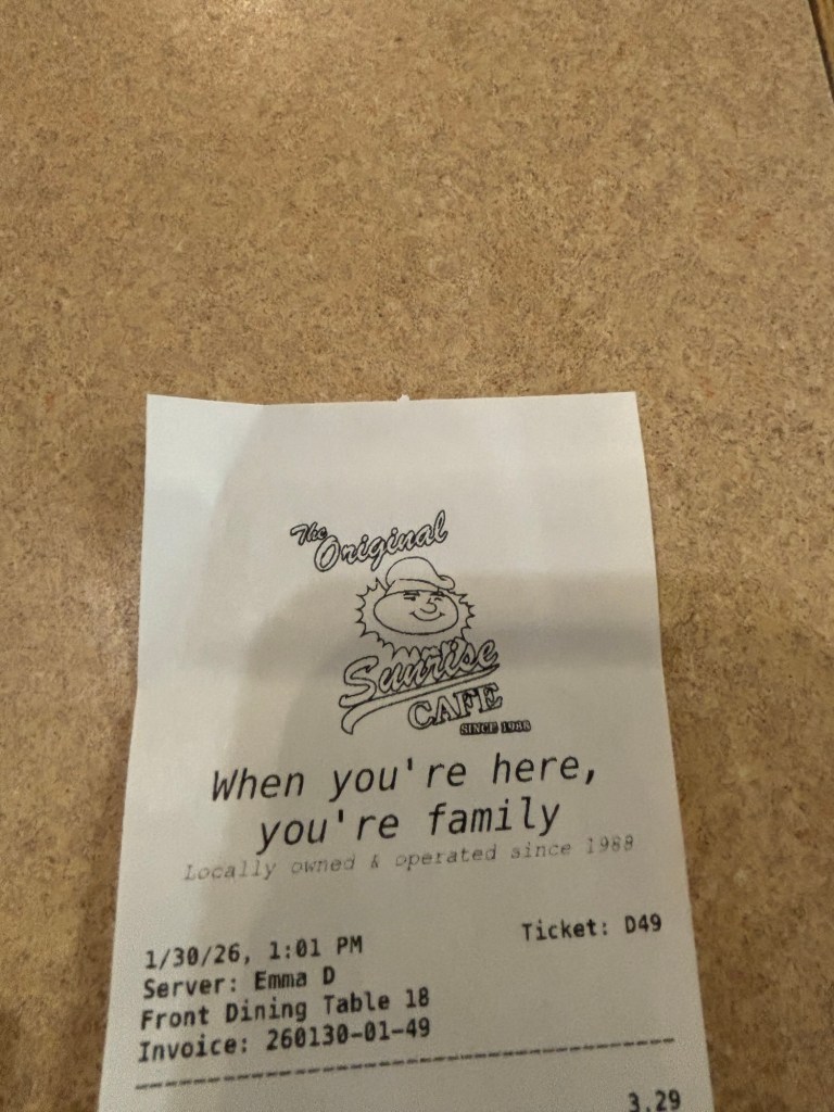 Hello to you. I am writing from the Sunrise Cafe. I walked over as I couldn’t stand my own company any longer. My ear condition is real bad today too. I got what I needed even before my meal – a big hug from Emma the manager! She is such a joy! Sometimes that’s all we need is a big hug and a warm hello and Emma does just that. When I left I thanked her for the hug and she thanked me back! She needed the hug too that’s why she did it.