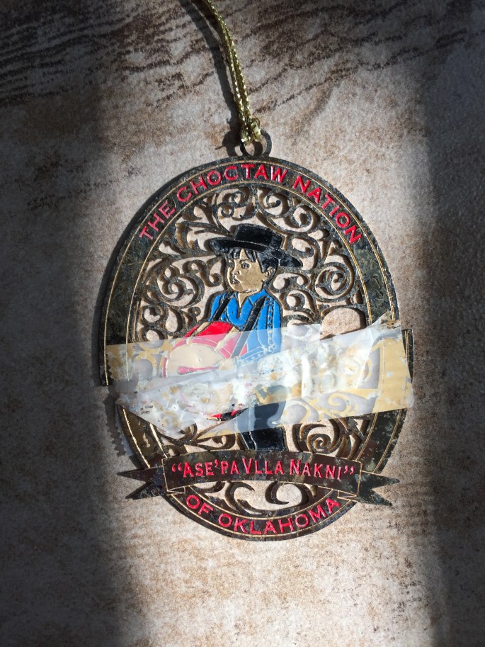 So this story really began on 18 April 2014 when I, the sad and lonely Princess, was out walking in the fields down the street from our house. I found half of a Christmas ornament! The ornament said, ‘Ase Pa Vlla Nakni’ of Oklahoma. I had to look this up on the internet to find out what it meant. The Choctaw language loosely translated, it was about the arrival of a male child. Much to my delight and surprise, a couple of days later I found the other half of the same Christmas ornament at the entrance to our neighborhood. The top half had a picture of a little drummer boy and said ‘The Choctaw Nation.’